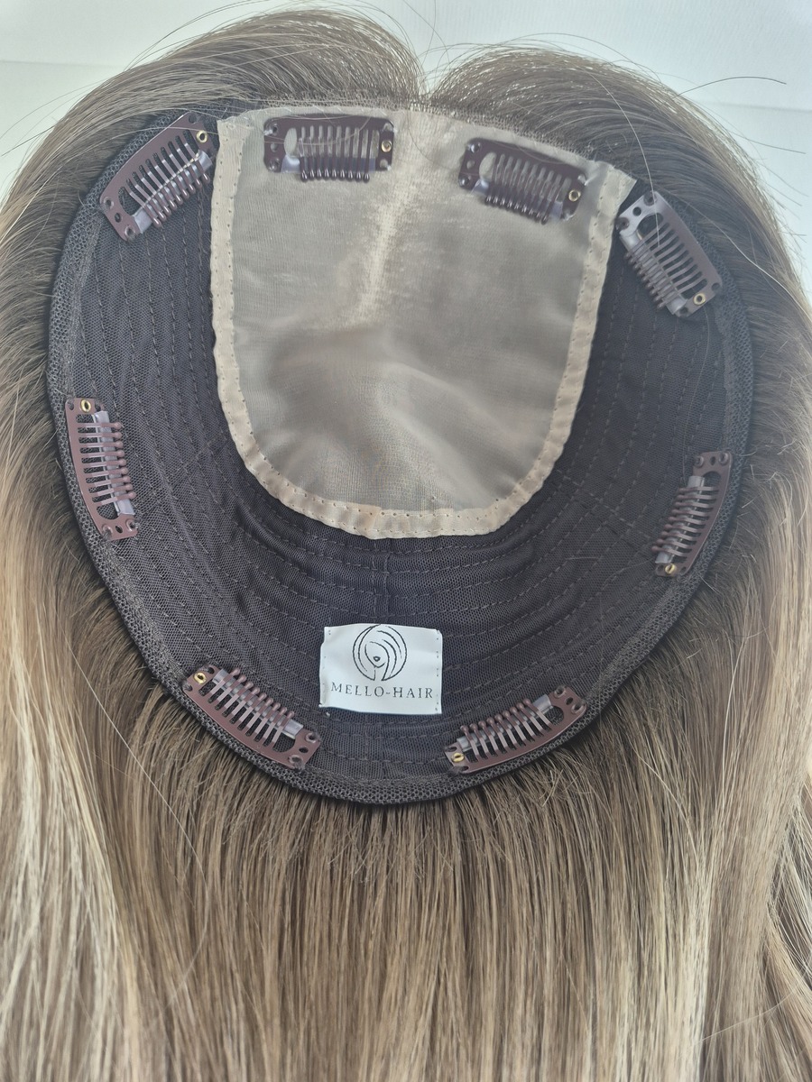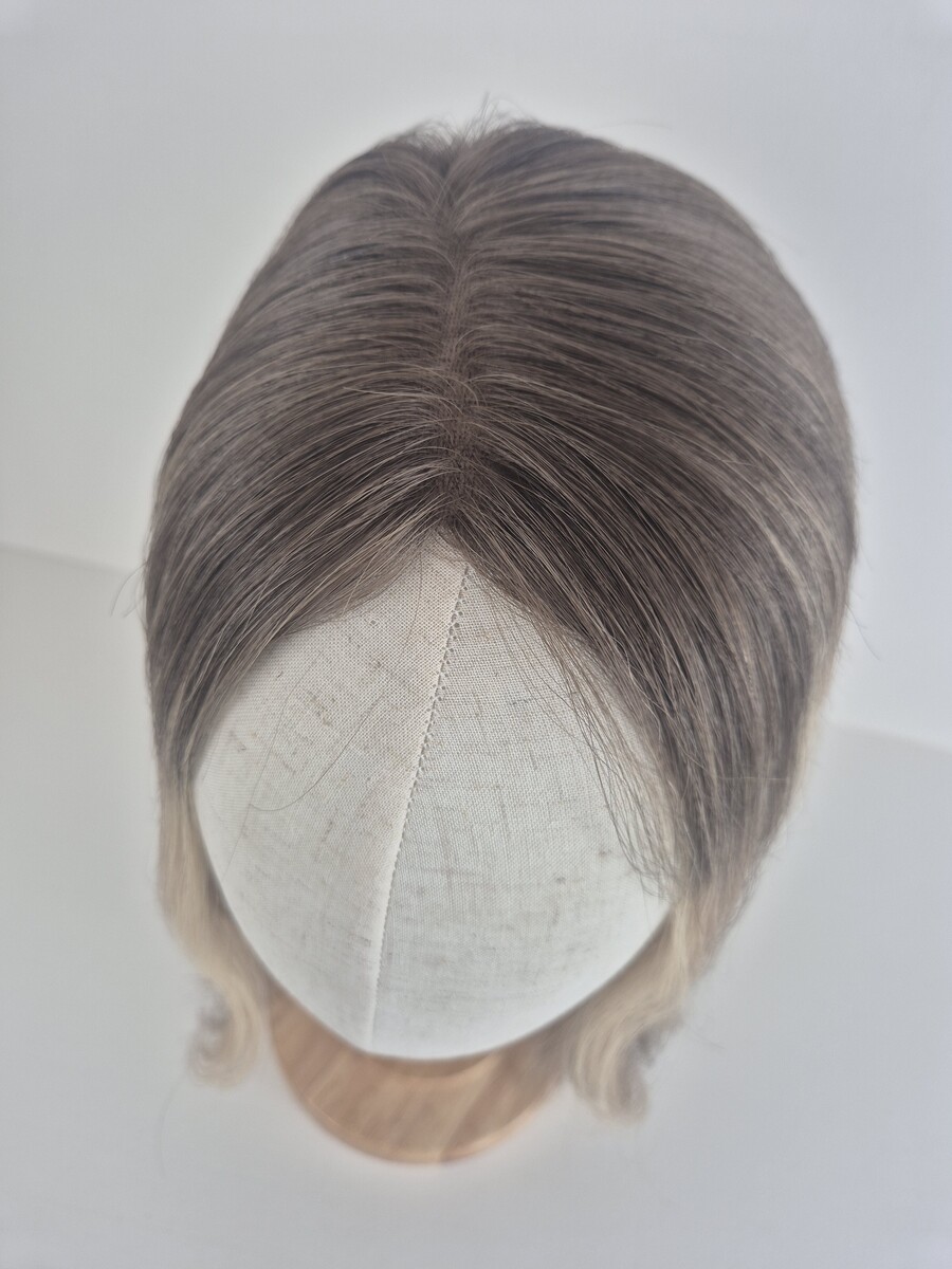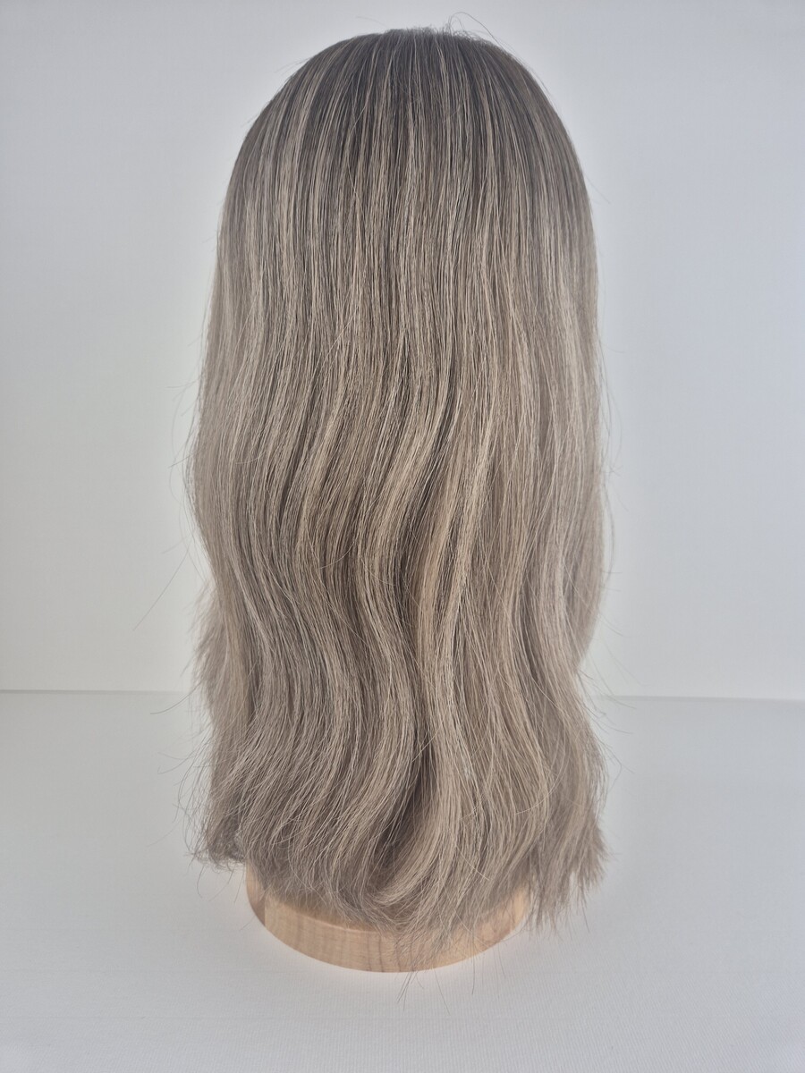 Ava – 16 inch length – mushroom blonde with an ash brown root and added dimensions.