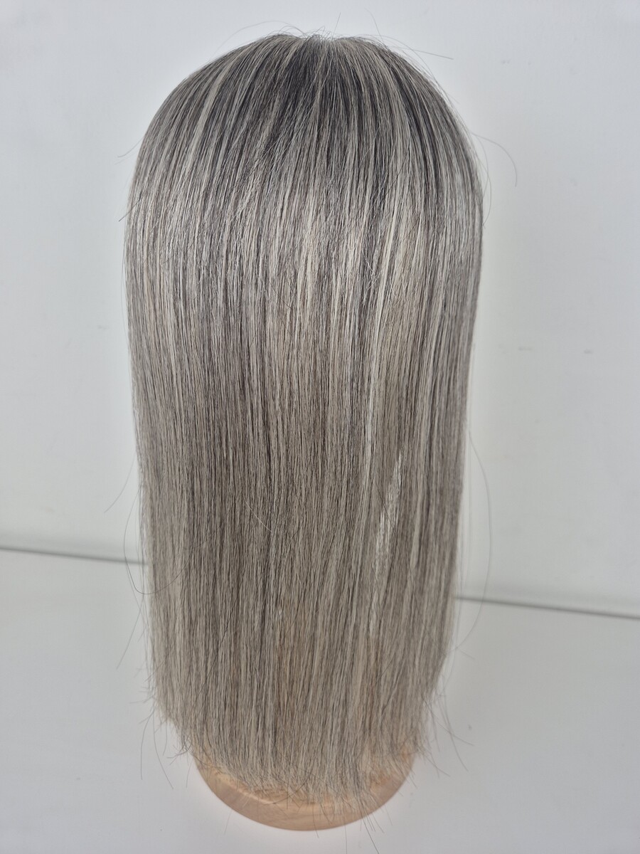 Evelyn – 16 inch length ash grey blend – silver strands mixed with dark ash blonde.