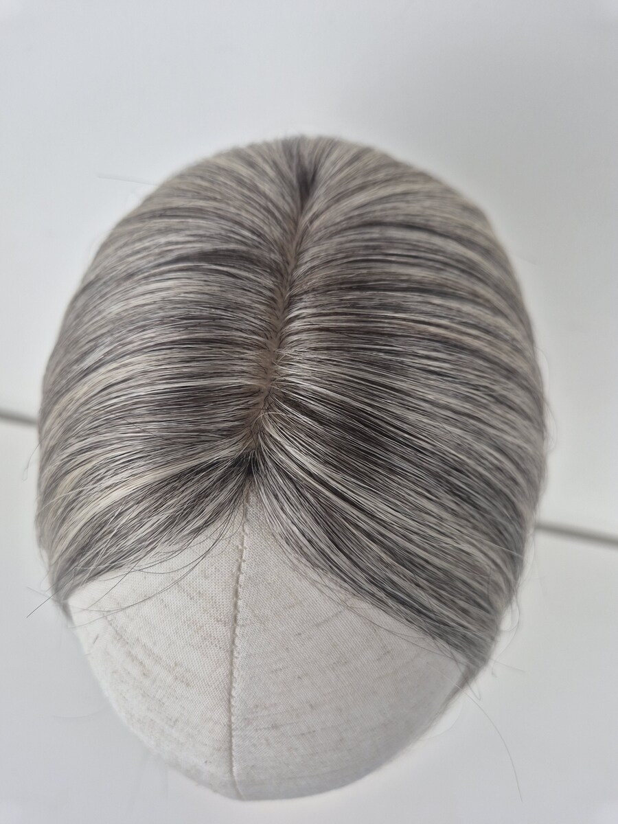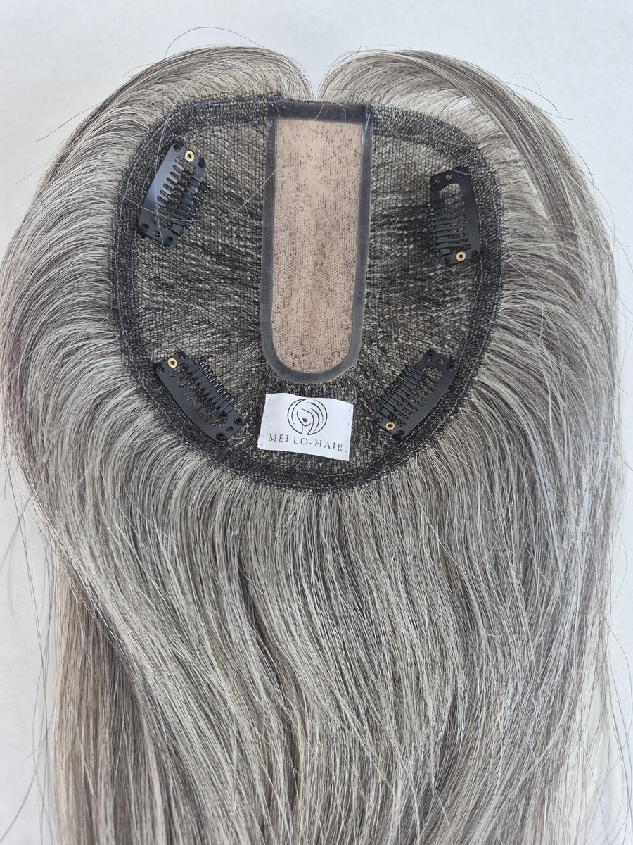 Featuring a 5” x 5” base with a 1.5” x 3.5” silk parting for a realistic scalp look, this lightweight, breathable, and flexible topper with five pressure sensitive clips. The Tiny Topper feels almost weightless, perfect for hair-up styles or warmer holiday climates.